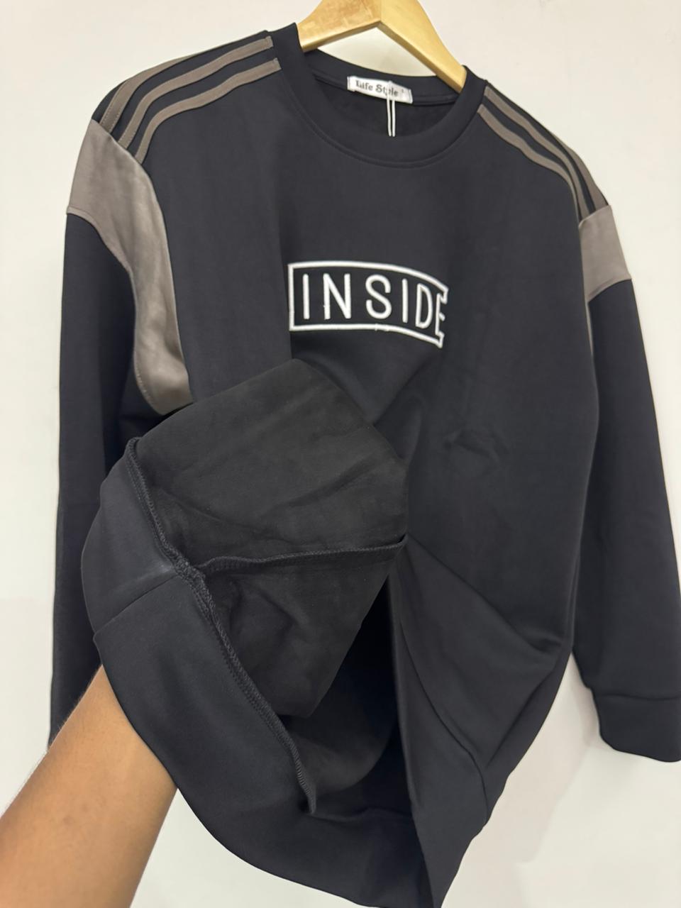Experience the perfect blend of style and coziness. This black pullover features contrasting shoulder panels, athletic stripe detailing, and a modern “INSIDE” graphic. Feel The Fabric, Live The Comfort with this essential wardrobe addition.