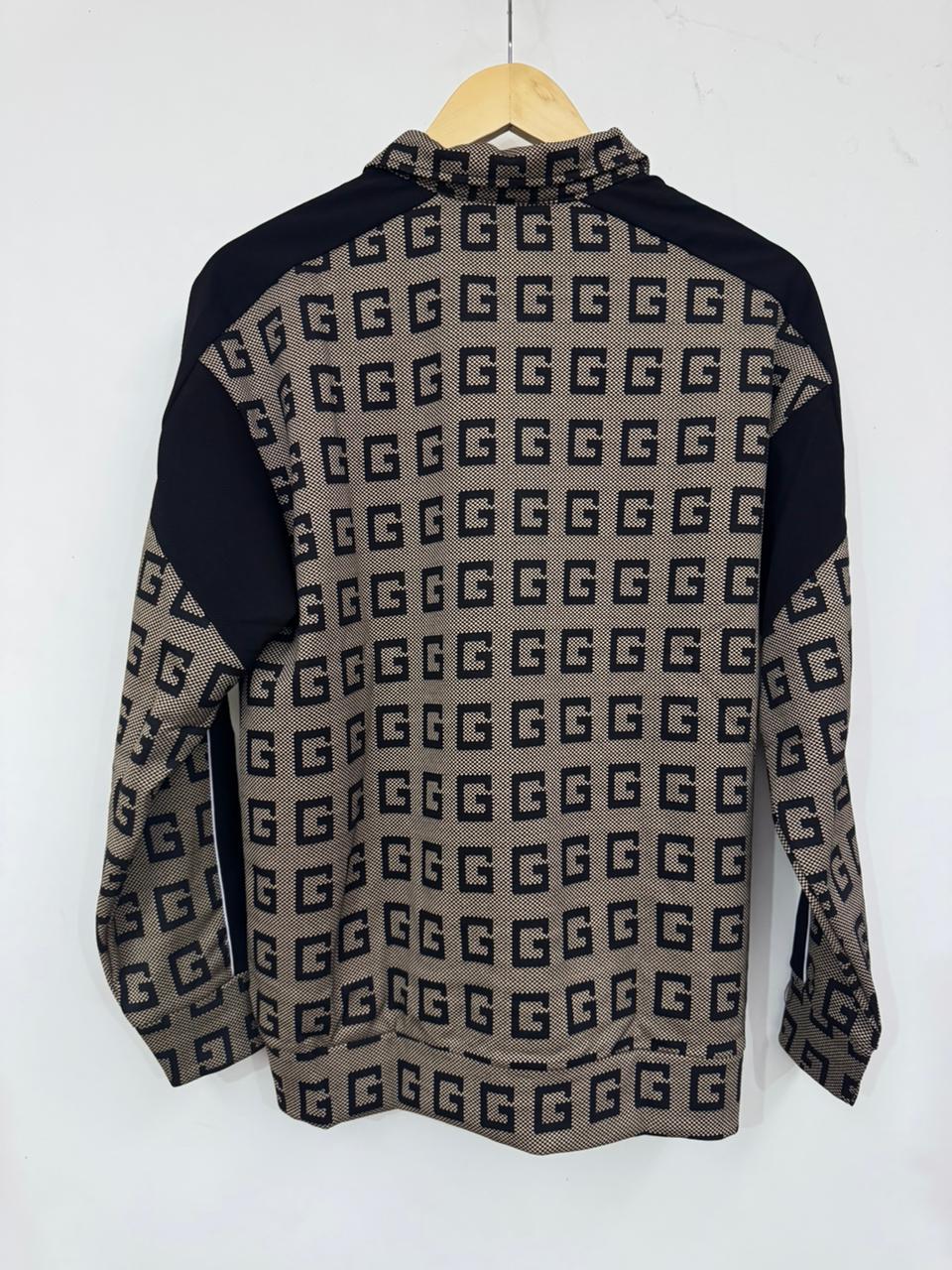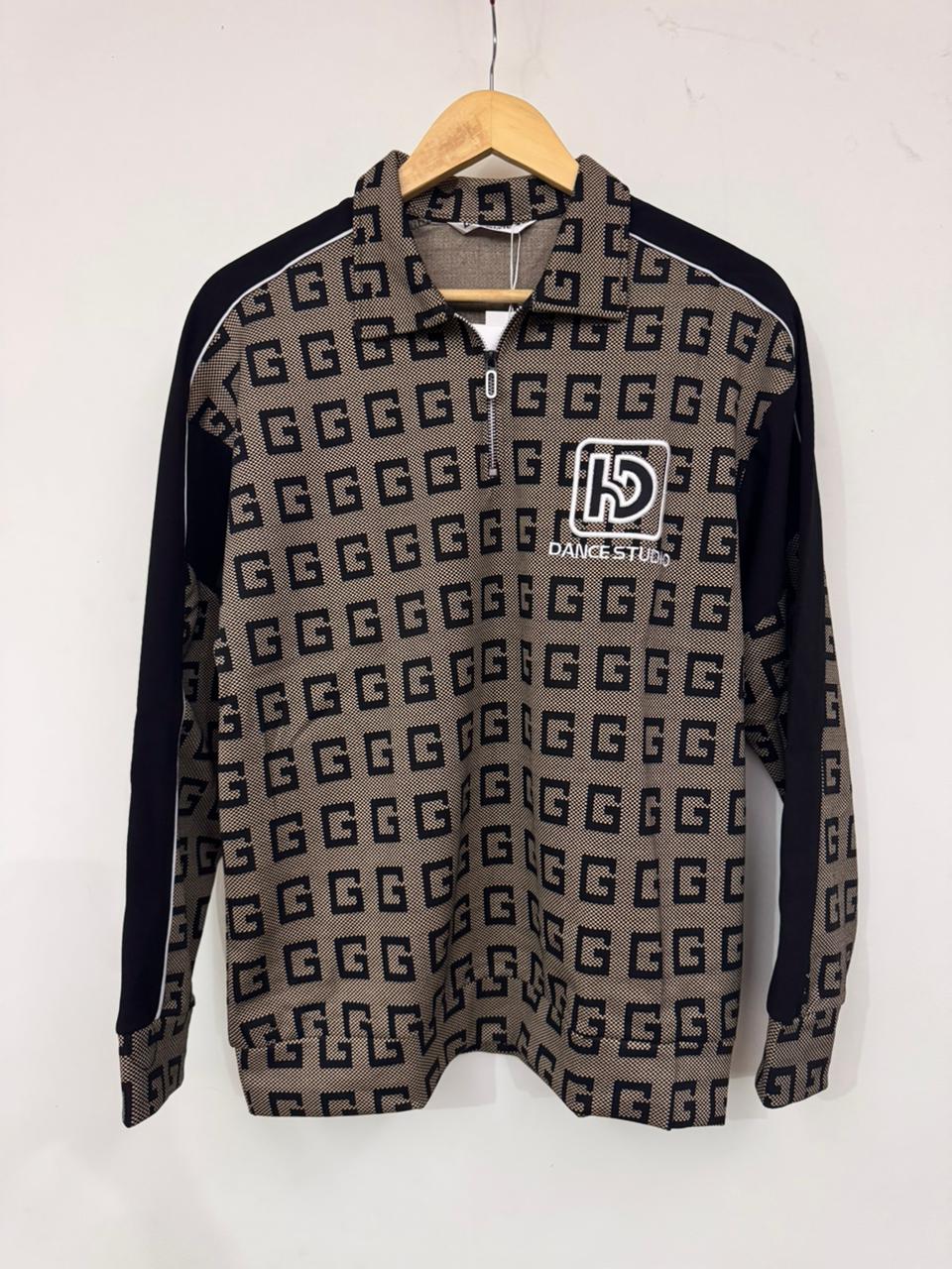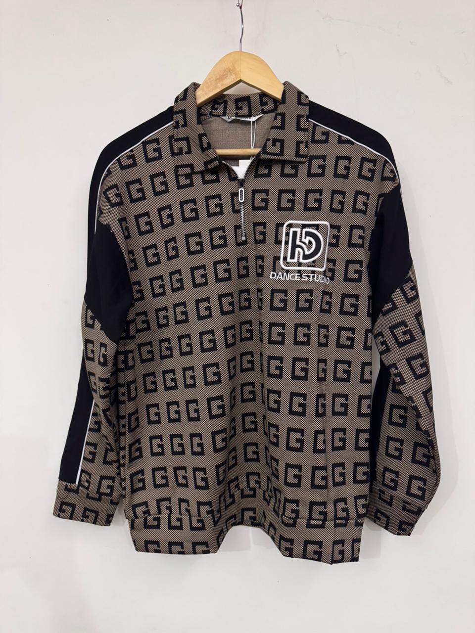 Feel The Fabric, Live The Comfort. Make a bold, graphic statement with the Monogram Zip Polo Jacket. This distinctive long-sleeve top features a sophisticated tan and black repeating “G” monogram pattern across the body. The design is contrasted by sleek, solid black sleeves accented with white piping along the shoulder seams, creating a sharp, structured silhouette. A practical quarter-zip placket provides versatile styling. The chest is detailed with a unique embroidered-style patch that includes the graphic “15” and the text “DANCE STUDIO”. Crafted from a comfortable, medium-weight fabric, this jacket is perfect for adding an expressive layer to your outfit, blending athletic utility with high-fashion influence.